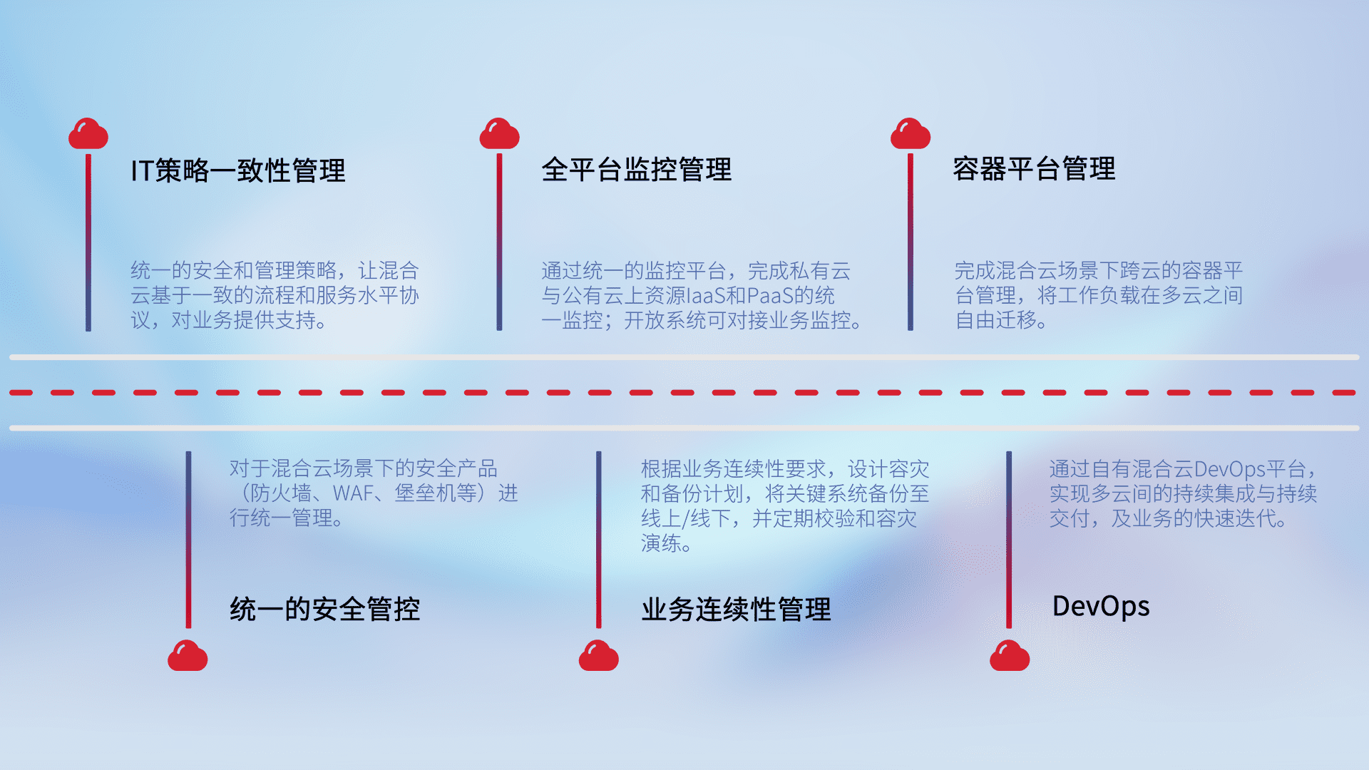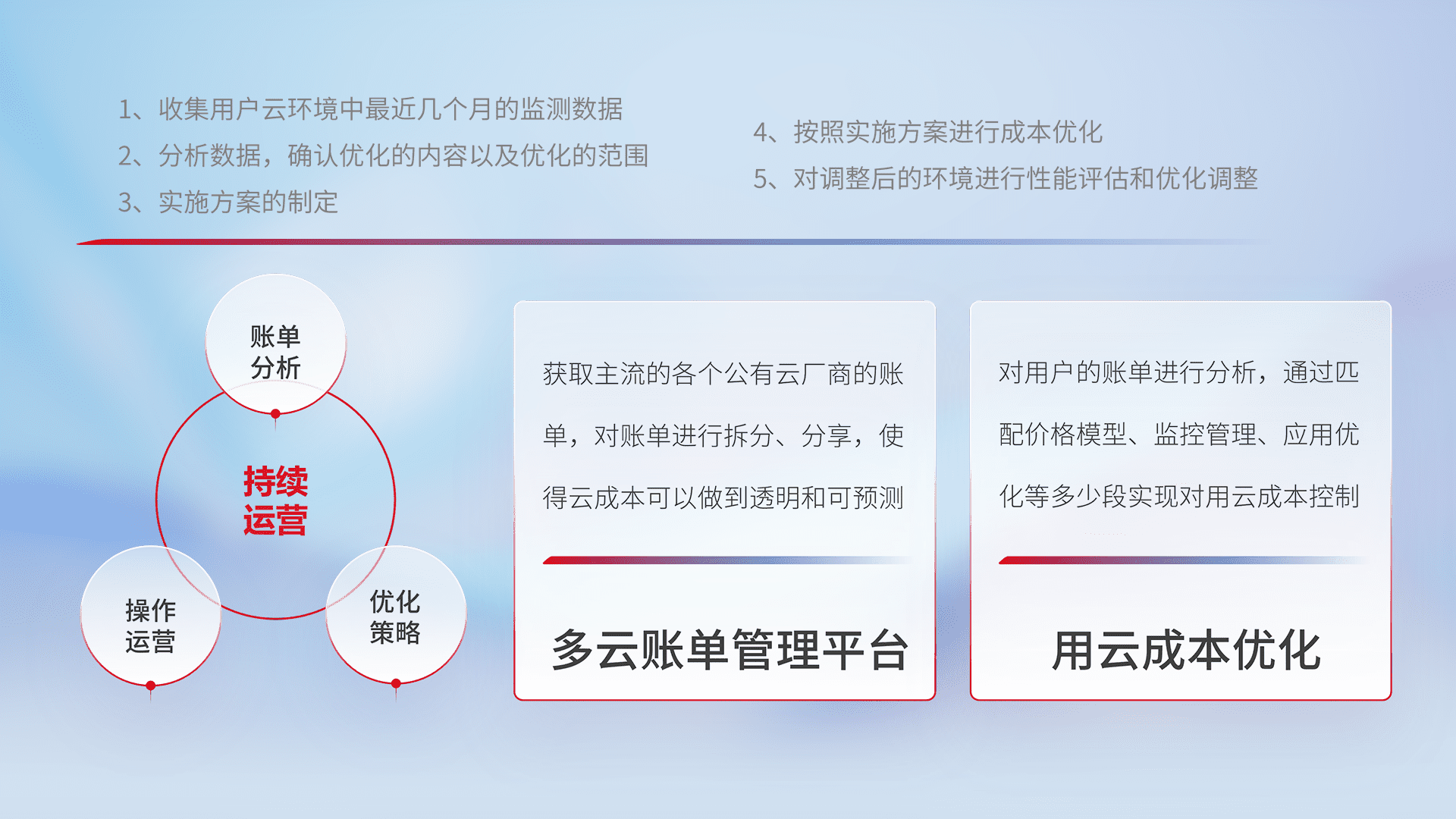 通过多云纳管,,,,以统一的资源数据模型把客户的云资源进行抽象和封装,,,,进而实现对多云资源的统一操作,,,保障云资源管理的可靠性、、稳定性与可用性。。。量身定制化运维内容,,,配置、、开发运维、、、、补丁管理、、、、备份、、监控、、、、认证和访问管理、、审计和日常巡检等,,,保障在用云过程中的可靠度,,,稳定度以及高可用率。。。。