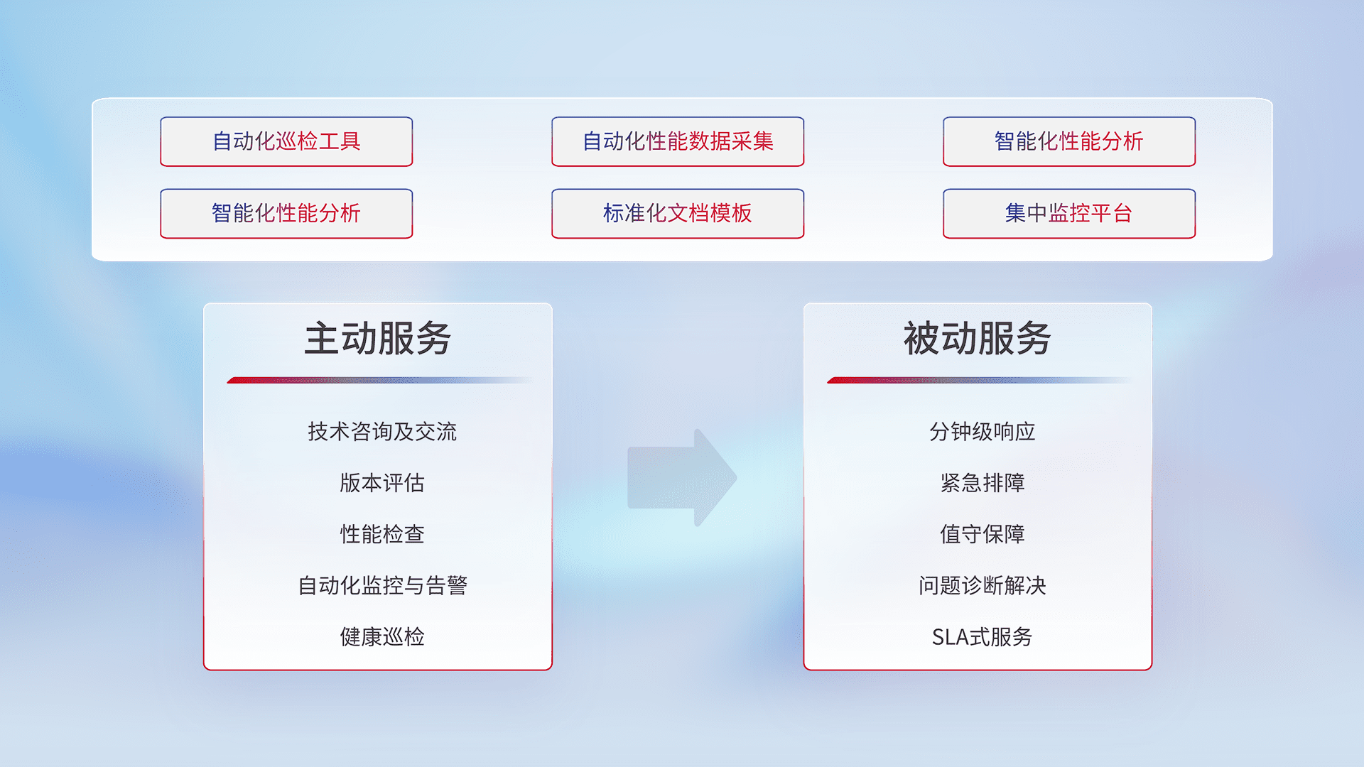 智能化工具和标准化文档,,保障服务质量,,,,提供主动服务(包含技术咨询、、、、版本评估、、、性能检查、、、自动化监控与告警、、、、健康巡检)和被动服务包含(分钟级响应、、、、紧急排障、、、值守保障、、、、问题诊断解决、、SLA服务)。。。